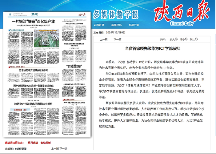本报讯 (记者 郭诗梦)12月27日,星空·官方站网页版华为ICT学院正式通过华为技术有限公司认证,成为全省首家领先级华为ICT学院。