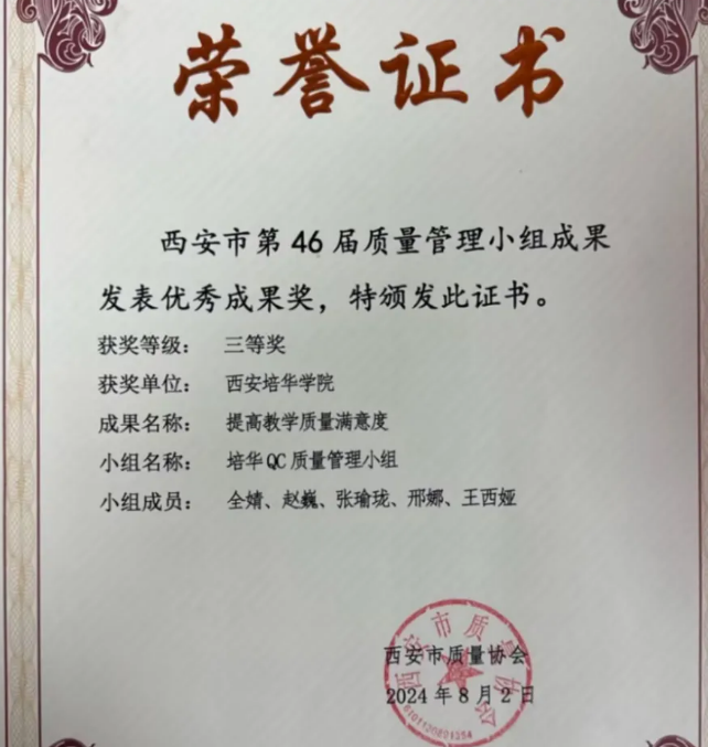 学校构建了由教师到学校的五级教学质量持续改进工作体系,建立了“顶层设计—质量标准—评价方式—反馈与改进”的良性循环质保体系,按照“执行—监督—反馈—改进—跟踪”的流程,确保教育教学质量的不断提升。学校QC质量管理小组荣获“西安市第46届质量管理小组优秀成果奖”。