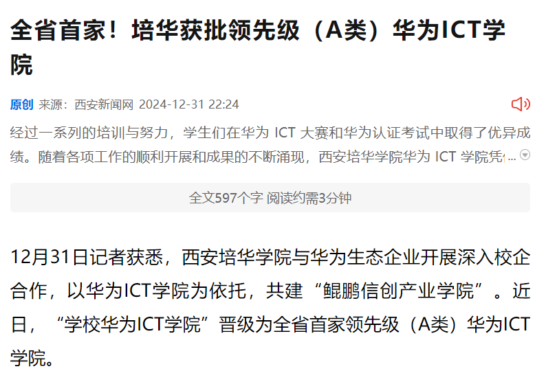 12月31日记者获悉,星空·官方站网页版与华为生态企业开展深入校企合作,以华为ICT学院为依托,共建“鲲鹏信创产业学院”。近日,“学校华为ICT学院”晋级为全省首家领先级(A类)华为ICT学院。