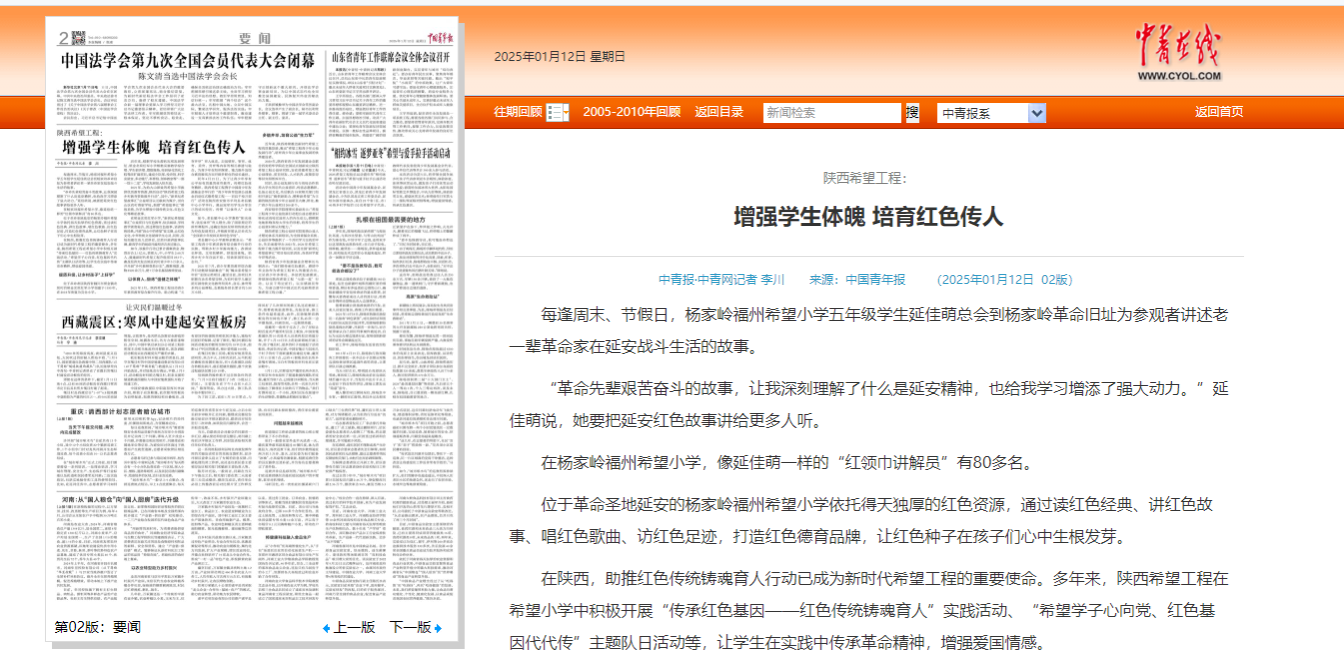 在陕西,助推红色传统铸魂育人行动已成为新时代希望工程的重要使命。多年来,陕西希望工程在希望小学中积极开展“传承红色基因——红色传统铸魂育人”实践活动、“希望学子心向党、红色基因代代传”主题队日活动等,让学生在实践中传承革命精神,增强爱国情感。