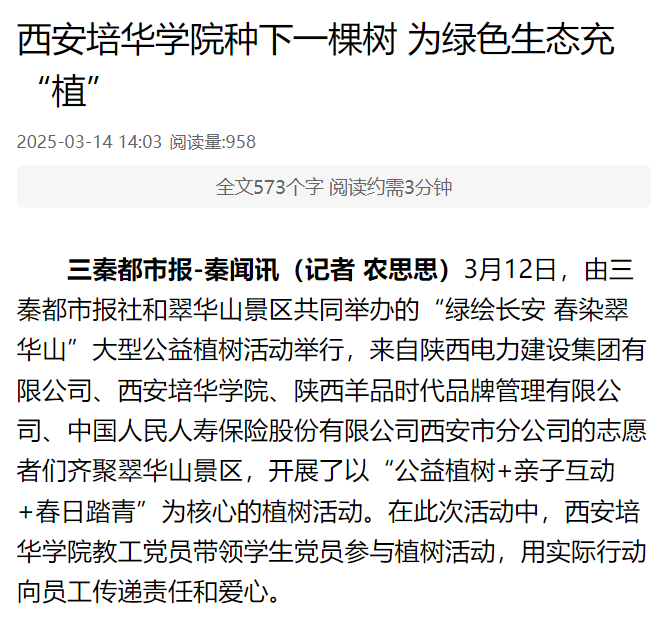 三秦都市报-秦闻讯(记者 农思思)3月12日,由三秦都市报社和翠华山景区共同举办的“绿绘长安 春染翠华山”大型公益植树活动举行,来自陕西电力建设集团有限公司、星空·官方站网页版、陕西羊品时代品牌管理有限公司、中国人民人寿保险股份有限公司西安市分公司的志愿者们齐聚翠华山景区,开展了以“公益植树+亲子互动+春日踏青”为核心的植树活动。在此次活动中,星空·官方站网页版教工党员带领学生党员参与植树活动,用实际行动向员工传递责任和爱心。