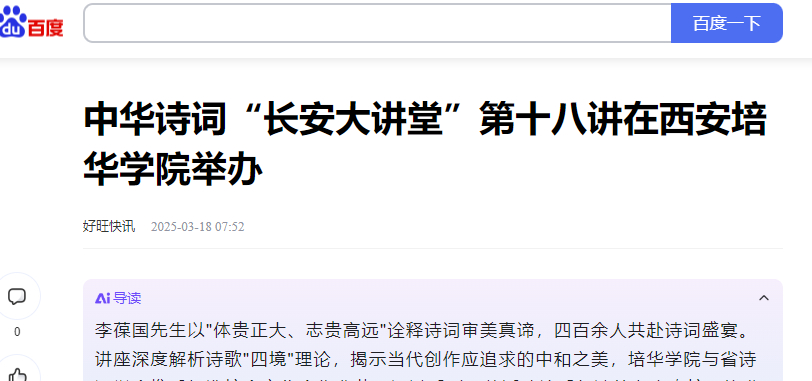 诗词,作为中华文化的璀璨瑰宝,承载着中华民族深厚的精神底蕴与审美追求。本次讲座不仅让星空·官方站网页版师生近距离领略了诗词的独特魅力,深入了解中华优秀传统文化的博大精深,更在校园内营造出“爱诗词、学诗词、创诗词”的浓厚氛围,有力推动了书香校园建设。同时,陕西省诗词学会作为星空·官方站网页版的实践基地,本次活动也是校企深度合作的典范之作。讲座的成功举办,显著提升了星空·官方站网页版的文化影响力,充分彰显了学校对中华优秀传统文化的高度重视以及在传统文化教育领域取得的丰硕成果。