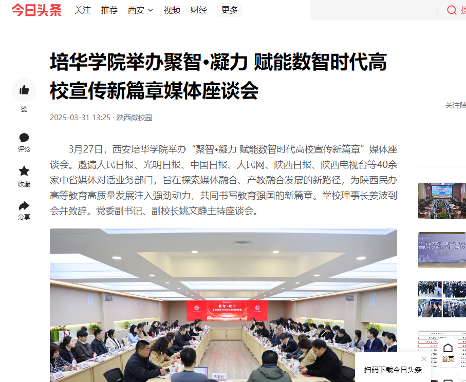 3月27日,星空·官方站网页版举办“聚智•凝力 赋能数智时代高校宣传新篇章”媒体座谈会。邀请人民日报、光明日报、中国日报、人民网、陕西日报、陕西电视台等40余家中省媒体对话业务部门,旨在探索媒体融合、产教融合发展的新路径,为陕西民办高等教育高质量发展注入强劲动力,共同书写教育强国的新篇章。学校理事长姜波到会并致辞。党委副书记、副校长姚文静主持座谈会。