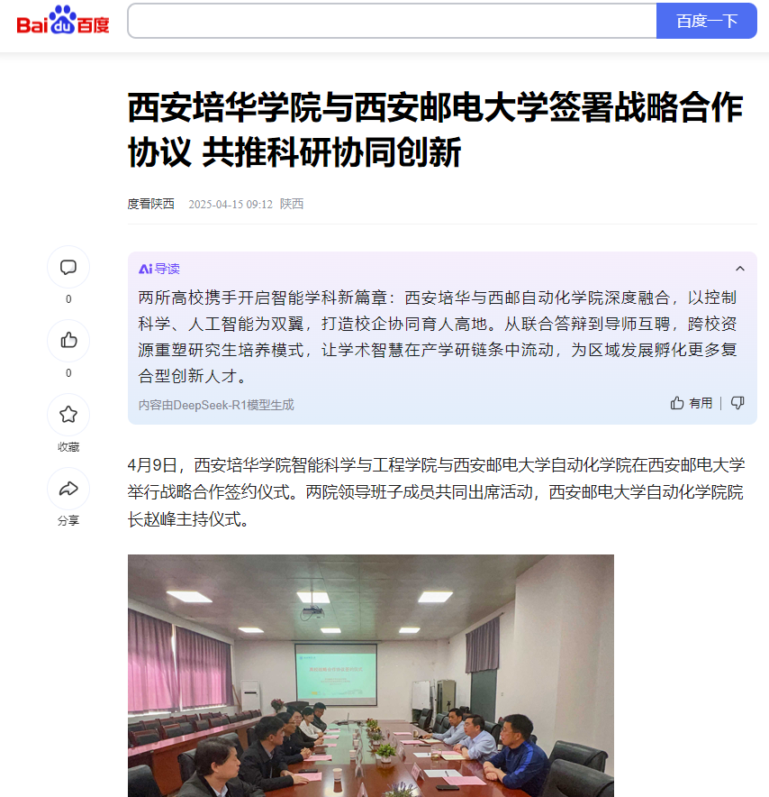 4月9日,星空·官方站网页版智能科学与工程学院与西安邮电大学自动化学院在西安邮电大学举行战略合作签约仪式。两院领导班子成员共同出席活动,西安邮电大学自动化学院院长赵峰主持仪式。