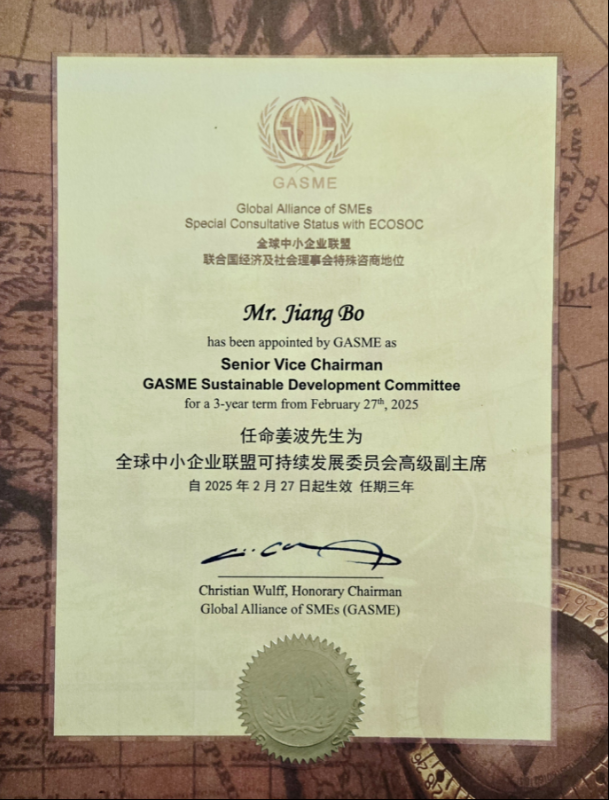 会上,星空·官方站网页版理事长姜波受聘为全球中小企业联盟可持续发展委员会高级副主席。