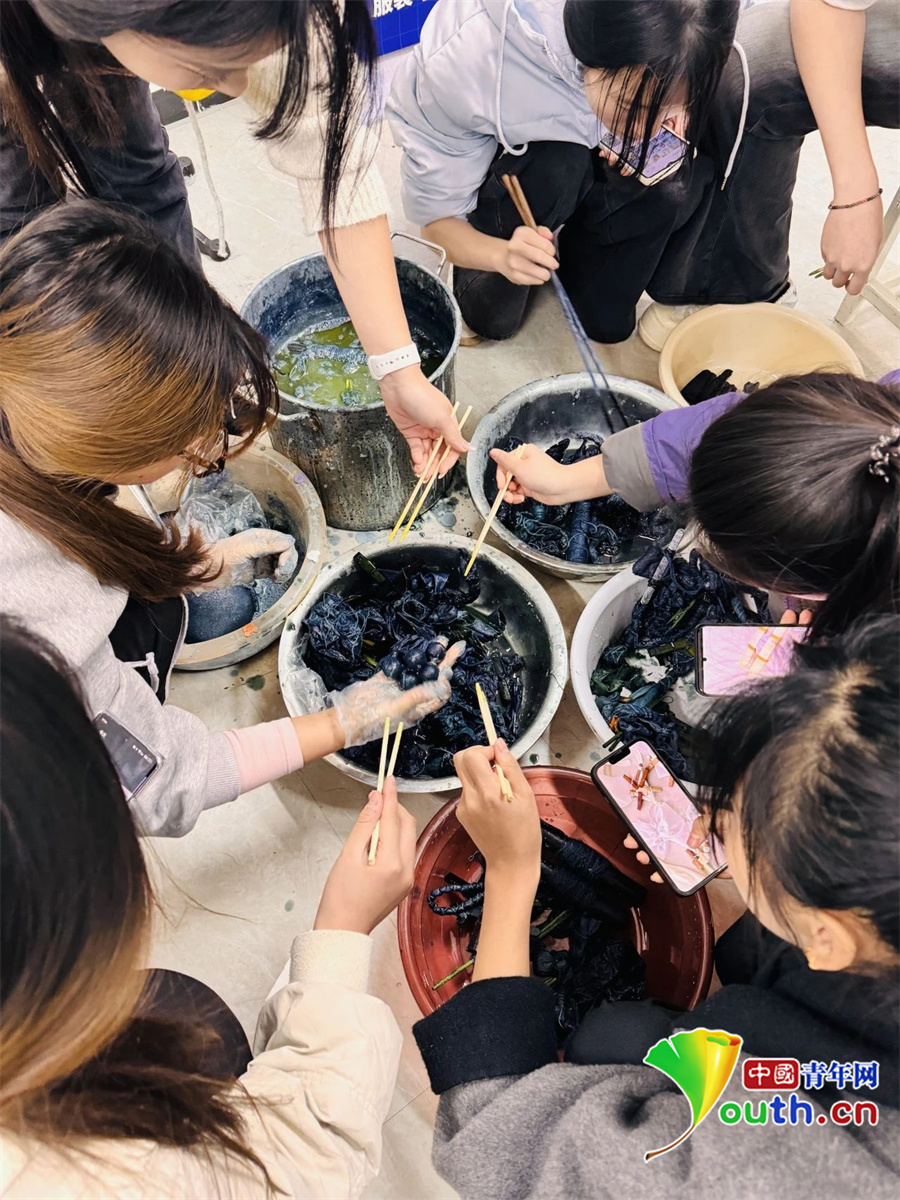 染缸前围满了好奇的身影,学生们轮流用木桨搅动靛蓝溶液,看沉淀的颜料在水波中翻涌成流动的星空,学生董淇良特意将染好的蓝布举到窗前,阳光穿透布料上的云纹扎痕,在地面投下斑驳的光影,“原来古人的扎染是把天空和云彩都缝进了布里”。他感叹。