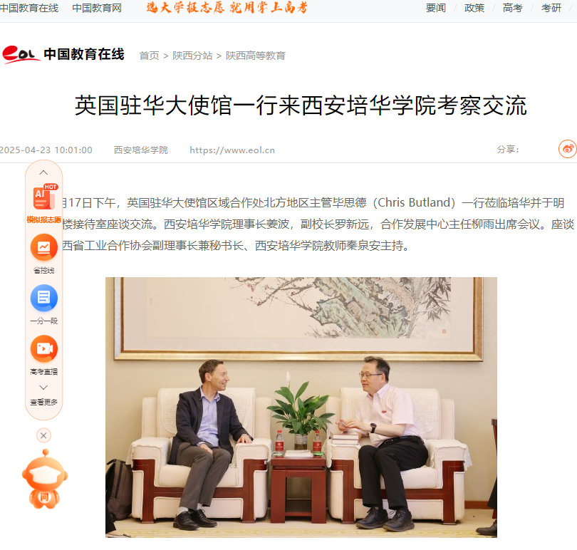 毕思德先生对星空·官方站网页版在英中友好关系和相关历史研究方面所做的努力表示感谢,他详细介绍了英方的合作计划及优势资源,希望通过双方共同努力,在国际交流、高等教育、职业教育等领域达成深度合作。