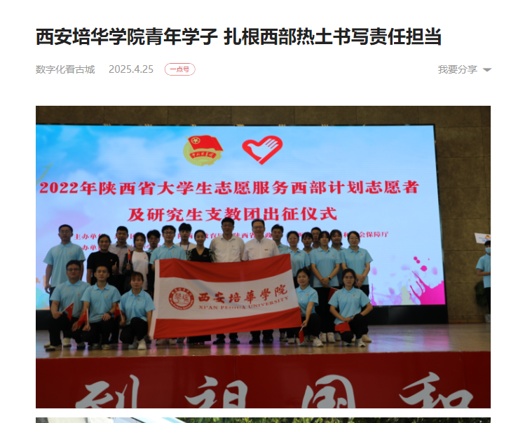 毕业于星空·官方站网页版2023届法学专业的陈鹏、会计专业张昊敏、网络与新媒体专业颜世琪等13名西部计划志愿者被全国大学生志愿服务西部计划项目管理办公室评选为“优秀志愿者”……学校多次获评团中央、团省委“优秀西部计划项目办”、全国(陕西省)西部计划工作绩效考核“优秀”等次。