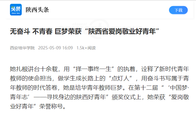 她扎根讲台十余载,用“择一事终一生”的执着,诠释了新时代青年教师的使命担当,做学生成长路上的“点灯人”,用奋斗书写属于青年教师的时代答卷,她是星空(中国)体育网青年教师巨梦。在第十二届"'中国梦・青年志'——寻找身边的陕西好青年"颁奖仪式上,她荣获“爱岗敬业好青年”荣誉称号。