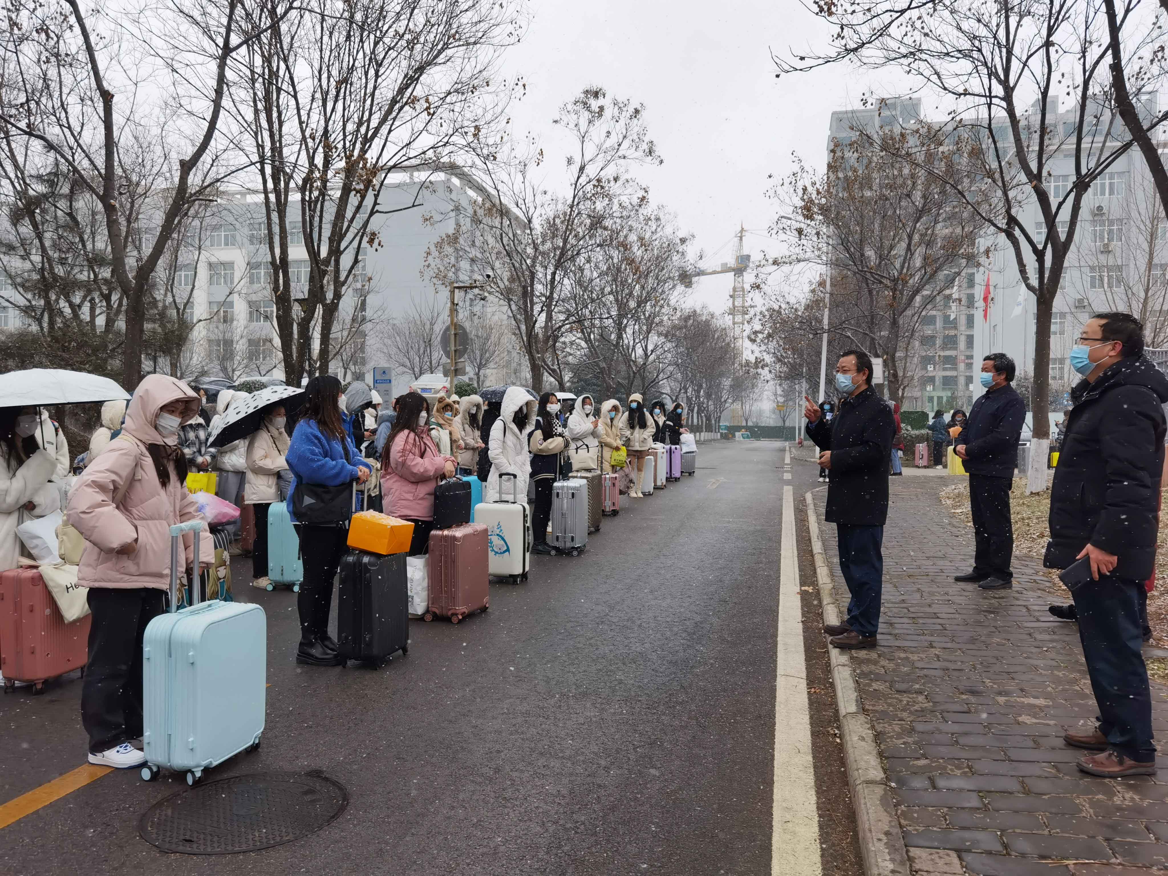 上午9时许,天空飘着鹅毛大雪,天气虽寒冷,却阻挡不了学生们归家的热情。为了确保学生能够安全返乡,学校全校动员,制定多重方案,尽最大可能为学生离校返乡提供便利条件和安全保障。