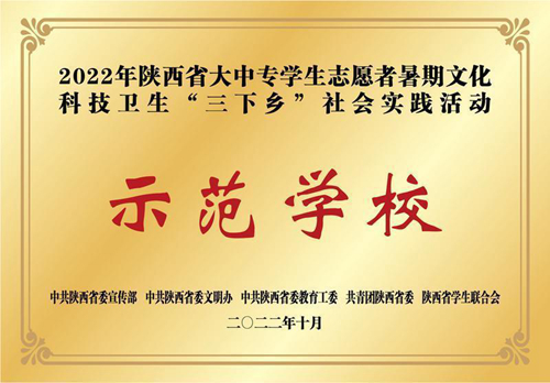 学校获得“全国暑期社会实践优秀单位”5次,陕西省“三下乡社会实践示范学校”5次,全国“镜头中的三下乡优秀组织单位”2次,全国暑期社会实践优秀团队、省级实践标兵团队、优秀团队、先进个人等荣誉30余项。