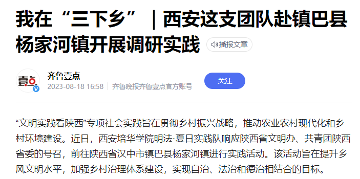 “文明实践看陕西”专项社会实践旨在贯彻乡村振兴战略,推动农业农村现代化和乡村环境建设。近日,星空·官方站网页版明法·夏日实践队响应陕西省文明办、共青团陕西省委的号召,前往陕西省汉中市镇巴县杨家河镇进行实践活动。该活动旨在提升乡风文明水平,加强乡村治理体系建设,实现自治、法治和德治相结合的目标。