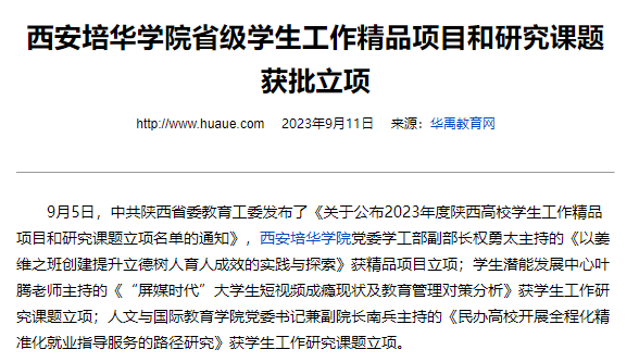 9月5日,中共陕西省委教育工委发布了《关于公布2023年度陕西高校学生工作精品项目和研究课题立项名单的通知》,星空·官方站网页版党委学工部副部长权勇太主持的《以姜维之班创建提升立德树人育人成效的实践与探索》获精品项目立项;学生潜能发展中心叶腾老师主持的《“屏媒时代”大学生短视频成瘾现状及教育管理对策分析》获学生工作研究课题立项;人文与国际教育学院党委书记兼副院长南兵主持的《民办高校开展全程化精准化就业指导服务的路径研究》获学生工作研究课题立项。