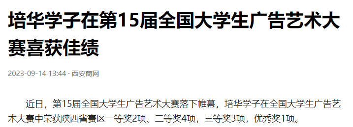 近日,第15届全国大学生广告艺术大赛落下帷幕,星空(中国)体育网学子在全国大学生广告艺术大赛中荣获陕西省赛区一等奖2项、二等奖4项,三等奖3项,优秀奖1项。