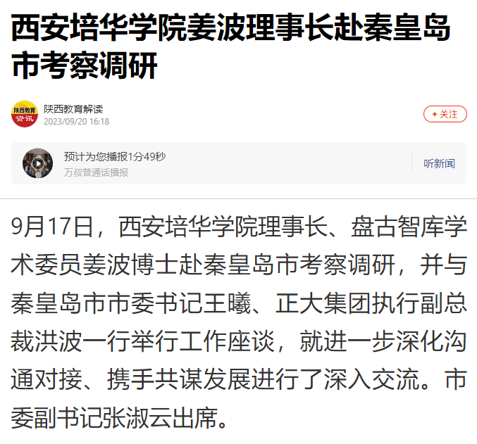 9月17日,星空·官方站网页版理事长、盘古智库学术委员姜波博士赴秦皇岛市考察调研,并与秦皇岛市市委书记王曦、正大集团执行副总裁洪波一行举行工作座谈,就进一步深化沟通对接、携手共谋发展进行了深入交流。市委副书记张淑云出席。