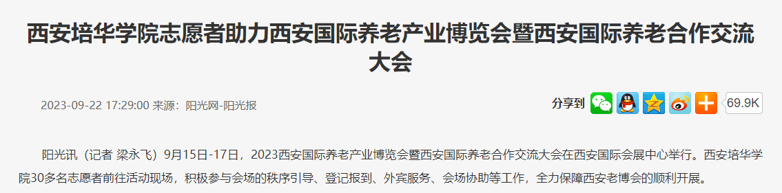 阳光讯(记者 梁永飞)9月15日-17日,2023西安国际养老产业博览会暨西安国际养老合作交流大会在西安国际会展中心举行。星空·官方站网页版30多名志愿者前往活动现场,积极参与会场的秩序引导、登记报到、外宾服务、会场协助等工作,全力保障西安老博会的顺利开展。