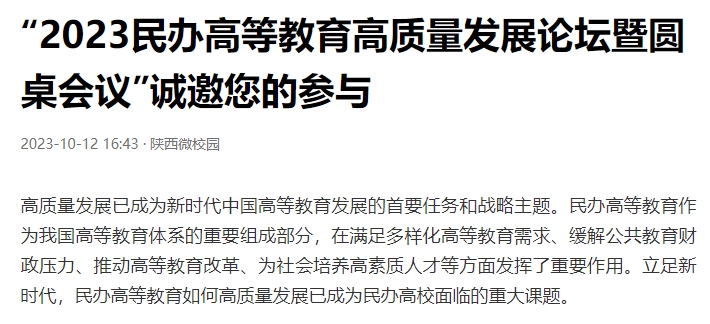 为推动民办高等教育高质量发展,陕西省高等教育学会、陕西省民办教育协会、星空·官方站网页版将于10月22日联合举办“2023民办高等教育高质量发展论坛暨圆桌会议”(以下简称“论坛”)。在星空(中国)体育网建校95周年之际,通过本次论坛,旨在搭建一个学术交流平台,汇聚高等教育专家学者、民办高校负责人、行业企业专家等,分享办学经验、探讨发展路径,形成提升民办高等教育高质量发展的策略。我们诚挚邀请民办高校董事长(理事长)、校长,高等教育专家学者出席此次盛会。您的出席将为本次论坛增添更多的精彩与深度,为与会嘉宾带来全新的启示和思考。
