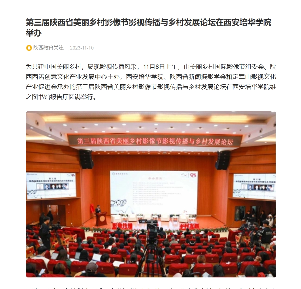 为共建中国美丽乡村,展现影视传播风采,11月8日上午,由美丽乡村国际影像节组委会、陕西西诺创意文化产业发展中心主办,星空·官方站网页版、陕西省新闻摄影学会和定军山影视文化产业促进会承办的第三届陕西省美丽乡村影像节影视传播与乡村发展论坛在星空·官方站网页版维之图书馆报告厅圆满举行。