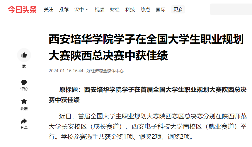 本次大赛以“筑梦青春志在四方,规划启航职引未来”为主题。陕西省93所高校的39.5万余名学生参与了大赛,最终有200名选手入围省赛。决赛分为现场陈述、评委提问(综合面试)、“天降(实习)offer”等多个环节,经过激烈的角逐,学校人文与国际教育学院卜晓婷同学获得成长赛道高教组决赛金奖、人文与国际教育学院赵晨阳同学获得就业赛道高职组决赛银奖、医学院燕心雨同学获得成长赛道高教组决赛银奖、传媒学院张欣同学获得就业赛道高教组决赛,总成绩在全省同类院校中位列第一,晋级名额及奖牌数量,在同类院校中位列第一。