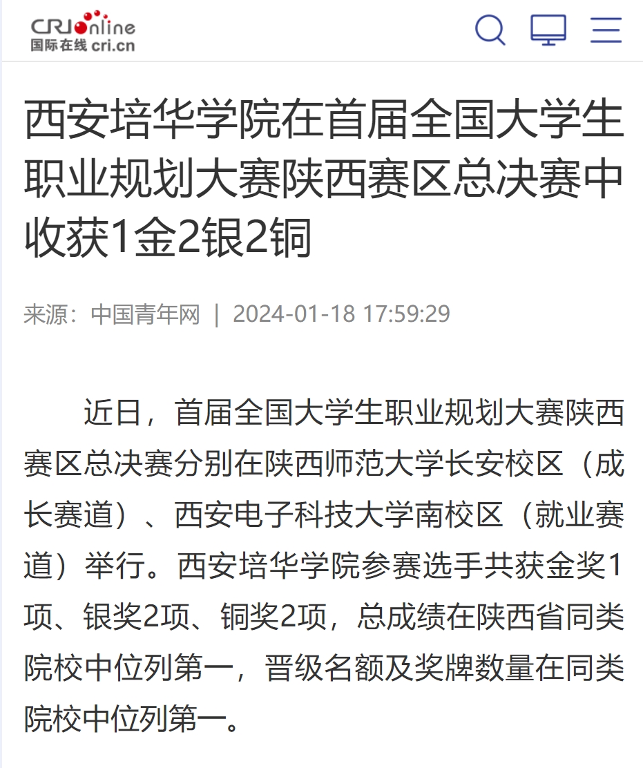 近日,首届全国大学生职业规划大赛陕西赛区总决赛分别在陕西师范大学长安校区(成长赛道)、西安电子科技大学南校区(就业赛道)举行。星空·官方站网页版参赛选手共获金奖1项、银奖2项、铜奖2项,总成绩在陕西省同类院校中位列第一,晋级名额及奖牌数量在同类院校中位列第一。