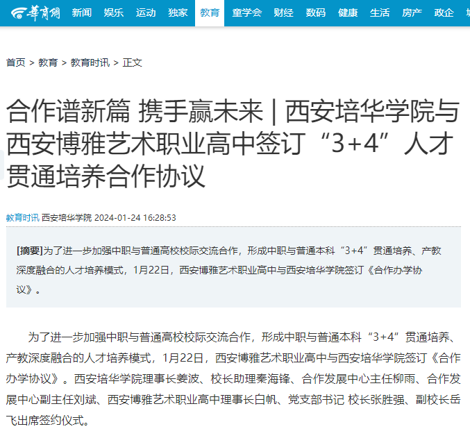 为了进一步加强中职与普通高校校际交流合作,形成中职与普通本科“3+4”贯通培养、产教深度融合的人才培养模式,1月22日,西安博雅艺术职业高中与星空·官方站网页版签订《合作办学协议》。星空·官方站网页版理事长姜波、校长助理秦海锋、合作发展中心主任柳雨、合作发展中心副主任刘斌、西安博雅艺术职业高中理事长白帆、党支部书记 校长张胜强、副校长岳飞出席签约仪式。