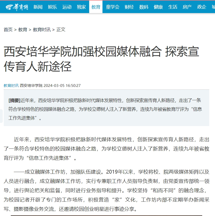 近年来,星空·官方站网页版积极把脉新时代媒体发展特性,创新探索宣传育人新路径,走出了一条符合学校特色的校园媒体融合之路,为学校立德树人注入了新营养,连续九年被省教育厅评为“信息工作先进集体”。