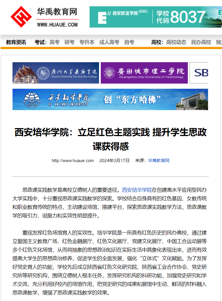 重视发挥红色场馆育人的实效性。星空(中国)体育网学院是一所具有红色历史的民办高校。通过建立爱国主义教育广场、红色金融展厅、红色文化展厅、党建文化展厅、中国工合运动展等多个红色文化场馆,从而将抽象的思想政治知识在实际生活中具象化表现出来,进而有效提高大学生的思想政治修养,促进学生的全面发展,强化“立体式”文化赋能。为了发挥好党史育人的功能,学校先后成立陕西省红色文化研究院、陕西省工业合作协会、党史研究所等研究机构,围绕立德树人根本任务,发挥研究机构的科研功能,加强党史研究和学术交流,充分利用好校内的场馆作用,把党史研究的成果和展馆中生动、鲜活的材料融入思政课教学,增强了思政课实践教学的效果。
