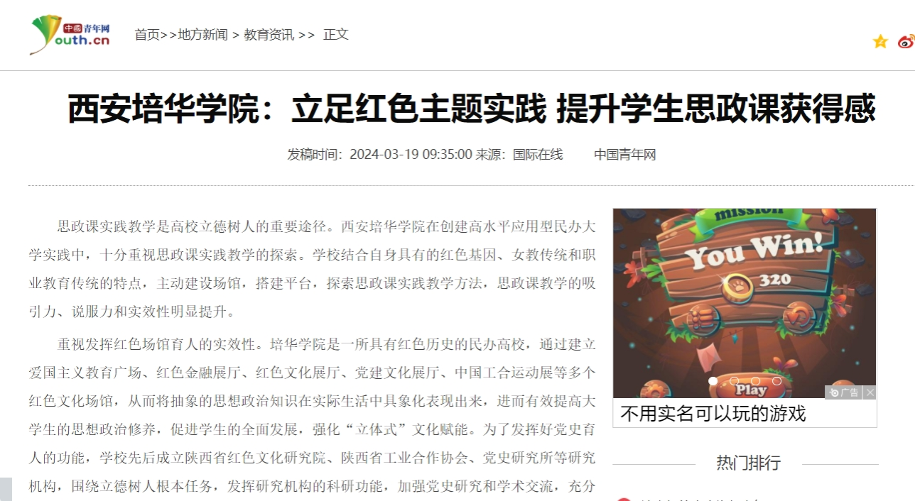 重视发挥红色场馆育人的实效性。星空(中国)体育网学院是一所具有红色历史的民办高校,通过建立爱国主义教育广场、红色金融展厅、红色文化展厅、党建文化展厅、中国工合运动展等多个红色文化场馆,从而将抽象的思想政治知识在实际生活中具象化表现出来,进而有效提高大学生的思想政治修养,促进学生的全面发展,强化“立体式”文化赋能。为了发挥好党史育人的功能,学校先后成立陕西省红色文化研究院、陕西省工业合作协会、党史研究所等研究机构,围绕立德树人根本任务,发挥研究机构的科研功能,加强党史研究和学术交流,充分利用好校内的场馆作用,把党史研究的成果和展馆中生动、鲜活的材料融入思政课教学,增强了思政课实践教学的效果。