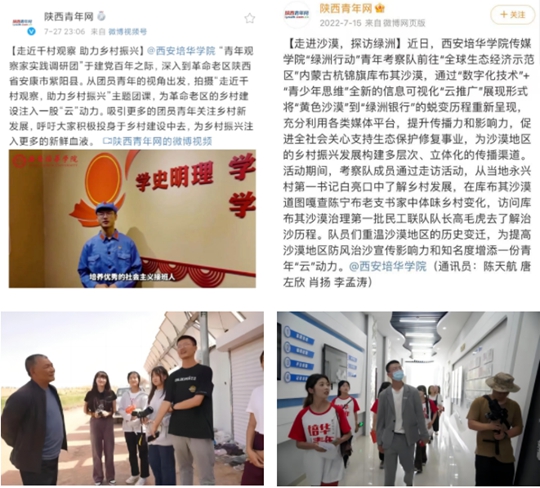 2022年7月,团队又走进全球生态经济示范区——内蒙古杭锦旗库布其沙漠,通过“云推广”的形式,将“黄色沙漠”到“绿洲银行”的蜕变历程展现给更多网络受众,为提高沙漠地区防风治沙宣传影响力和知名度,增添一份青年“云”动力。