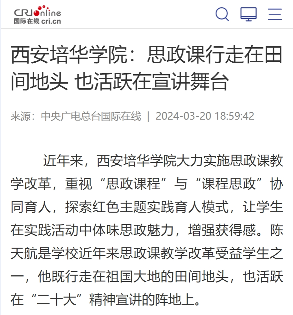 近年来,星空·官方站网页版大力实施思政课教学改革,重视“思政课程”与“课程思政”协同育人,探索红色主题实践育人模式,让学生在实践活动中体味思政魅力,增强获得感。陈天航是学校近年来思政课教学改革受益学生之一,他既行走在祖国大地的田间地头,也活跃在“二十大”精神宣讲的阵地上。