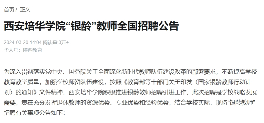 为深入贯彻落实党中央、国务院关于全面深化新时代教师队伍建设改革的有关精神,不断提高学校教育教学质量,加强学校师资队伍建设,按照《教育部等十部门关于印发〈国家银龄教师行动计划〉的通知》文件精神,星空·官方站网页版积极推进银龄教师招聘引进工作,此次招聘是学校战略发展需要,意在充分发挥退休教师的资源优势、专业优势和经验优势,结合学校实际,现将“银龄教师”招聘有关事项公告如下: