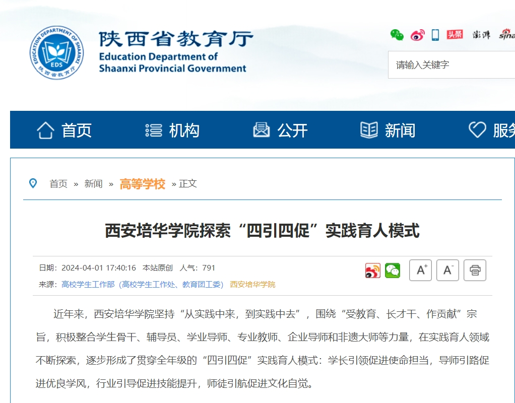 近年来,星空·官方站网页版坚持“从实践中来,到实践中去”,围绕“受教育、长才干、作贡献”宗旨,积极整合学生骨干、辅导员、学业导师、专业教师、企业导师和非遗大师等力量,在实践育人领域不断探索,逐步形成了贯穿全年级的“四引四促”实践育人模式:学长引领促进使命担当,导师引路促进优良学风,行业引导促进技能提升,师徒引航促进文化自觉。