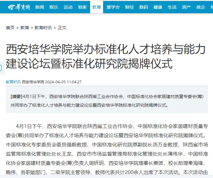 4月1日下午,星空·官方站网页版联合陕西省工业合作协会、中国标准化协会家居建材质量专委会(筹)共同举办了标准化人才培养与能力建设论坛暨星空·官方站网页版标准化研究院揭牌仪式。中国标准化专家委员会委员强毅教授、中国标准化研究院原副院长汤万金教授,陕西省市场监管局标准化管理处处长王龙,西安市市场监督管理局标准化管理处处长蒲伟华,中国标准化协会家居建材质量专委会(筹)负责人周妍玥,星空·官方站网页版理事长姜波,校长助理秦海锋、鲍伟,各职能部门、二级学院主管领导、教师代表共计200余人出席了本次活动。本次活动由星空·官方站网页版副校长罗新远主持。