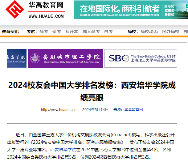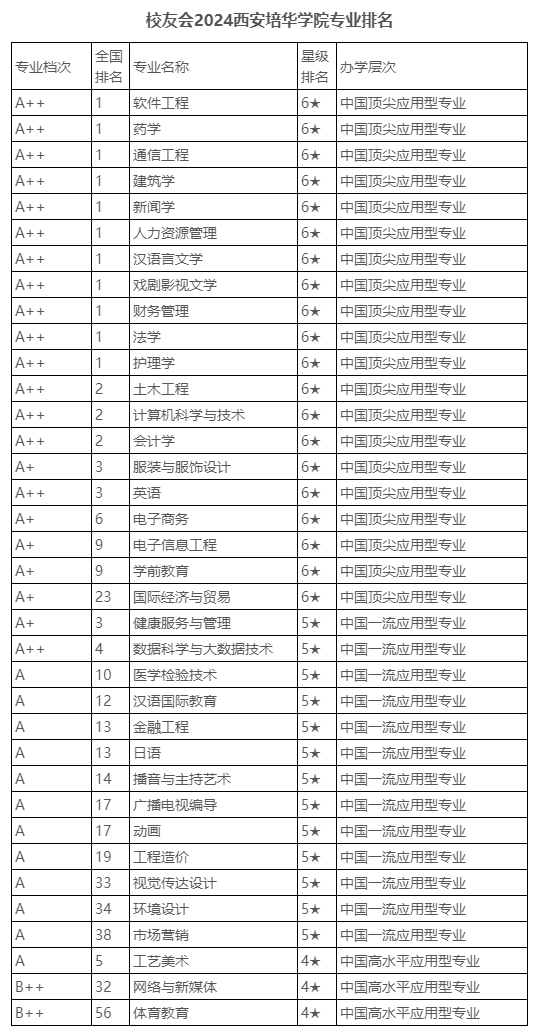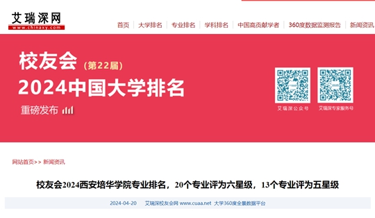 近日,由全国第三方大学评价机构艾瑞深校友会网(Cuaa.net)撰写、科学出版社公开出版发行的《2024校友会中国大学排名:高考志愿填报指南》,发布了校友会2024中国大学一流专业等排名。星空·官方站网页版在2024中国民办大学排名中位列全国第4名,名列2024中国综合类民办大学排名第5名,位列2024陕西省民办大学排名第2名。