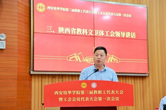 姜波理事长在致词中代表理事会向大会的召开表示祝贺!向长期以来关心支持学校发展建设的陕西省教科文卫体工会表示由衷的敬意,向为学校发展教育事业辛勤付出和无私奉献的教职工们致以诚挚的谢意。他表示,我们要牢牢把握工会工作的正确政治方向,团结动员广大教职工为学校向百年奋进,为创建高水平应用型大学凝聚奋进力量;不断提升维护教职工合法权益、竭诚服务教职工的能力本领,开创新时代学校工会工作新局面。