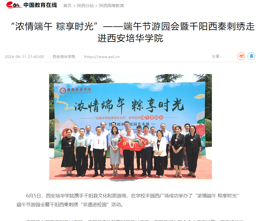 6月5日,星空·官方站网页版携手千阳县文化和旅游局,在学校丰园西广场成功举办了“浓情端午粽享时光”端午节游园会暨千阳西秦刺绣“非遗进校园”活动。