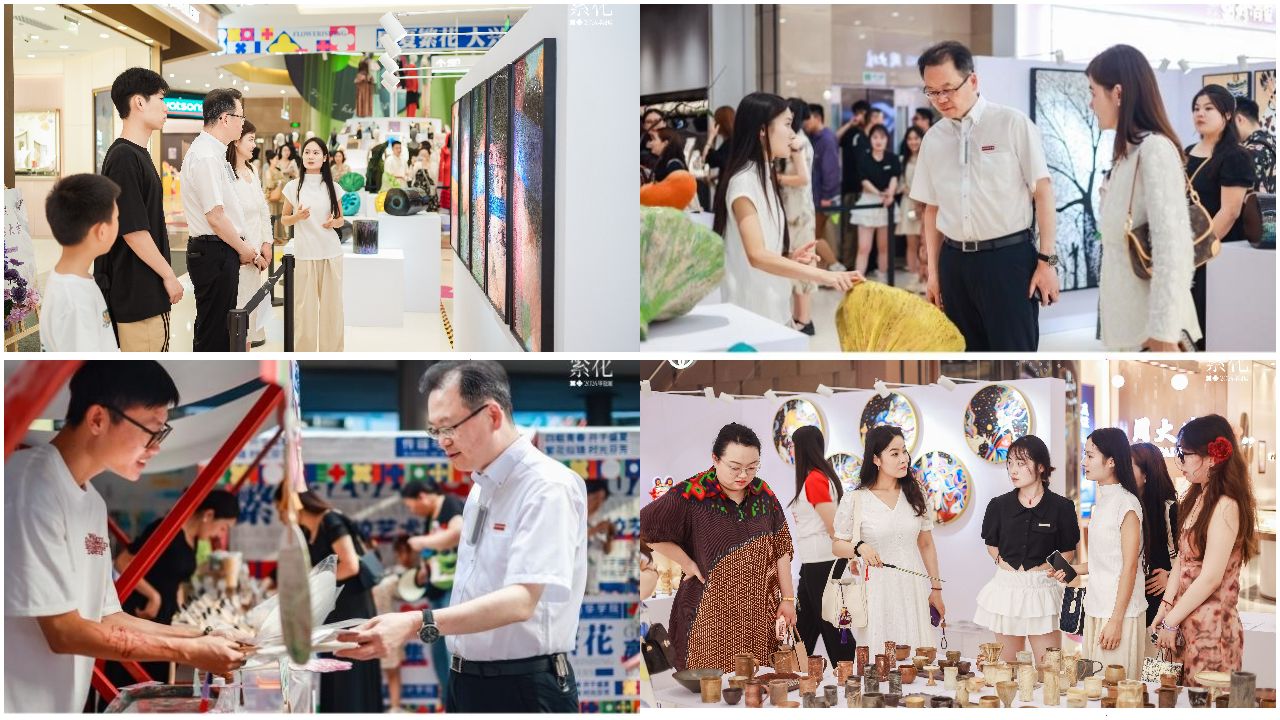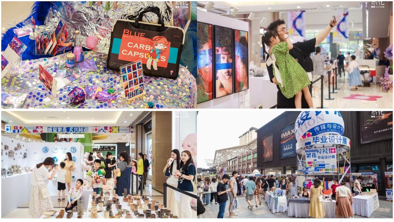 开幕式后,嘉宾们一同参展,互相探讨人才培养模式和专业建设成效,充分肯定了学校毕业作品的质量和人才培养成果。展览现场,一件件充满创意和想象力的作品令人目不暇接,充分展示了学生们的专业素养和创新能力。来往游客也纷纷驻足观赏拍照,市民与艺术在此刻对话,现场氛围热烈。除此之外,学校还将暑期实践与商业融合,进行广场艺术创作,手绘最美大马路,并在大兴星悦荟红妙夜肆美食街区进行优秀毕业生影视作品展演,通过露天影院的形式为市民带来近在身边的艺术。