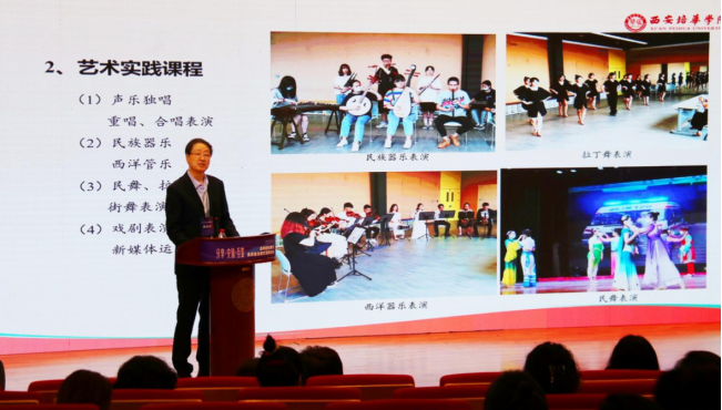刘荣弟主任作为唯一受邀的民办高校代表上台发言,他以《艺术赋能——探索浸润式美育新路径》为题,介绍了星空·官方站网页版的发展历史、学科门类及美育工作与经验。