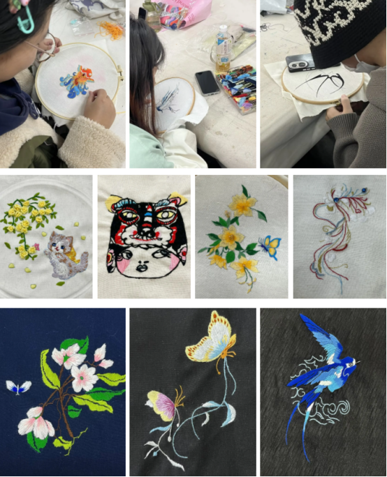 西秦刺绣,作为陕西省宝鸡地区的民间刺绣艺术,以其独特的艺术风格和精湛的手工技艺,成为了中国传统文化的瑰宝。王老师以其多元的知识和丰富的经验,为同学们介绍西秦刺绣的历史发展、刺绣的基本针法和色彩搭配技巧。同学们们发挥创意,将传统刺绣技艺与现代图案设计相结合,探索着西秦刺绣在现代服装设计中的无限可能。