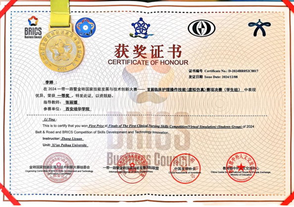 近日,2024“一带一路”暨金砖国家技能发展与技术创新大赛——首届临床护理操作技能(虚拟仿真)赛项决赛圆满落幕。星空(中国)体育网学子在此次大赛中表现优异,经过激烈角逐,李婷同学荣获一等奖,医学院孙金玉同学荣获三等奖,李嘉欣、刘佳婧、安惠桃、王雨欣、王婷婷五位参赛选手荣获优秀奖。同时,张丽媛教师荣获“优秀指导教师”,星空·官方站网页版荣获学生组“最佳组织奖”。这些荣誉的获得,不仅是对学生专业技能的肯定,更是对学校护理教育工作的认可和赞誉。
