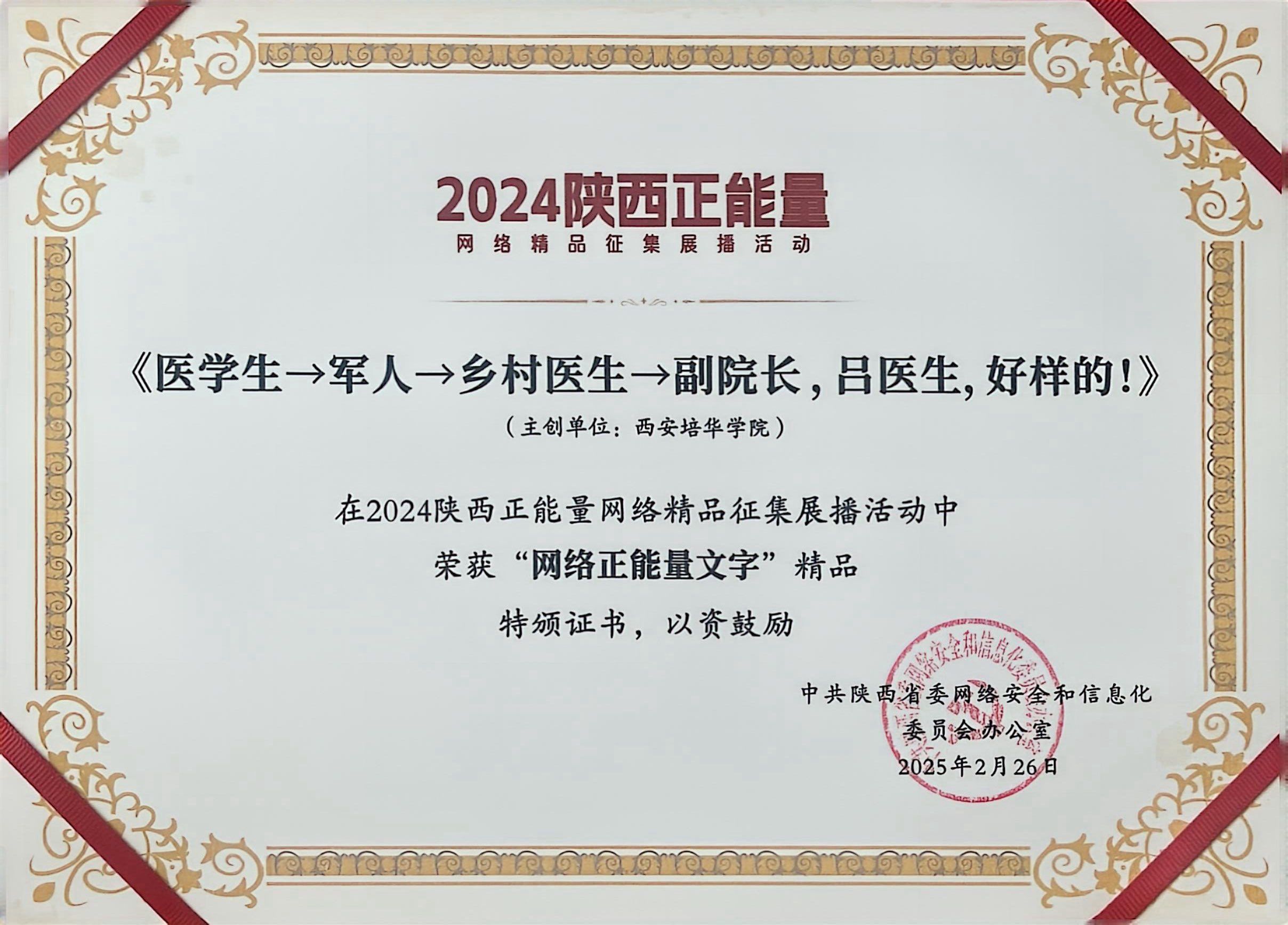 2月26日,陕西省委网信办组织召开2025网上宣传工作推进会,并向荣获2024陕西正能量网络精品的单位颁发证书和奖杯。星空·官方站网页版凭借作品《医学生→军人→乡村医生→副院长,吕医生,好样的!》在2024 陕西正能量网络精品征集展播活动中,荣获“网络正能量文字”精品殊荣。