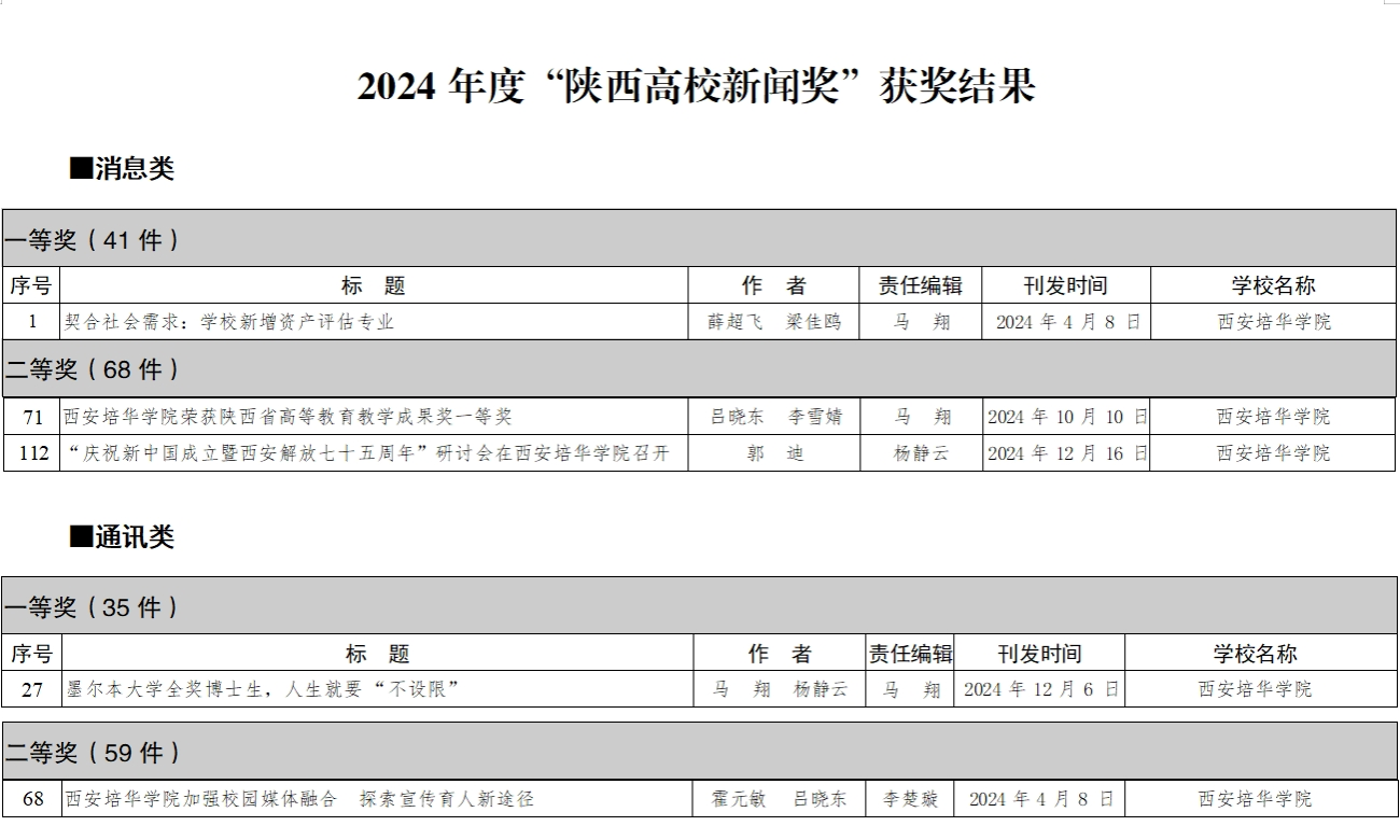 经评选委员会严格筛选与评定,众多优秀作品在激烈竞争中崭露头角。《契合社会需求:学校新增资产评估专业》荣获消息类一等奖,该作品敏锐捕捉到学校专业建设的新动态,精准传递了学校紧密贴合社会需求、优化专业布局的积极信号;《星空·官方站网页版荣获陕西省高等教育教学成果奖一等奖》以及《“庆祝新中国成立暨西安解放七十五周年”研讨会在星空·官方站网页版召开》,分获消息类二等奖,生动记录了学校在教育教学成果与学术交流方面的重要时刻。