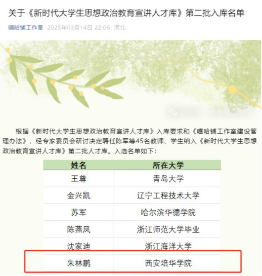 近日,根据《新时代大学生思想政治教育宣讲人才库》和《嘻哈铺工作室建设管理办法》要求,经专家委员会研讨,人文与国际教育学院辅导员朱林鹏入选新时代大学生思想政治教育宣讲人才库。