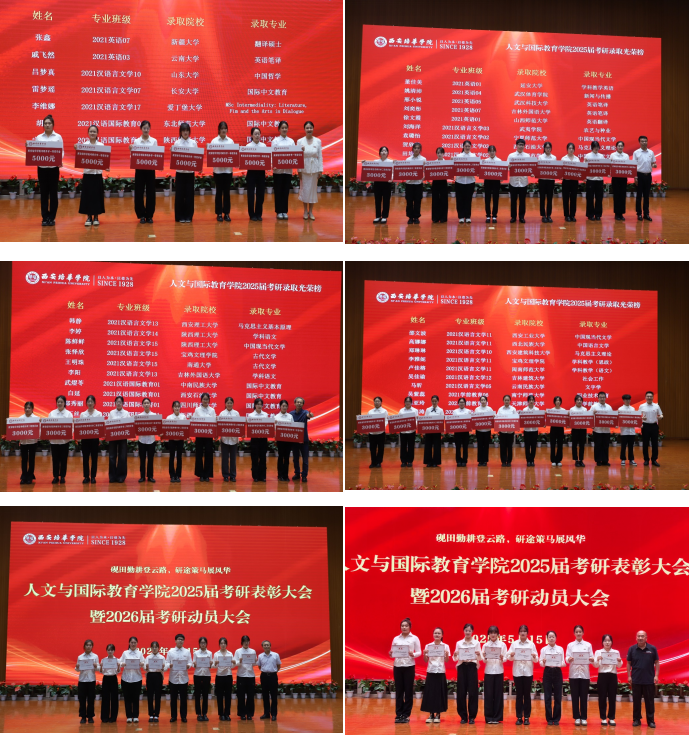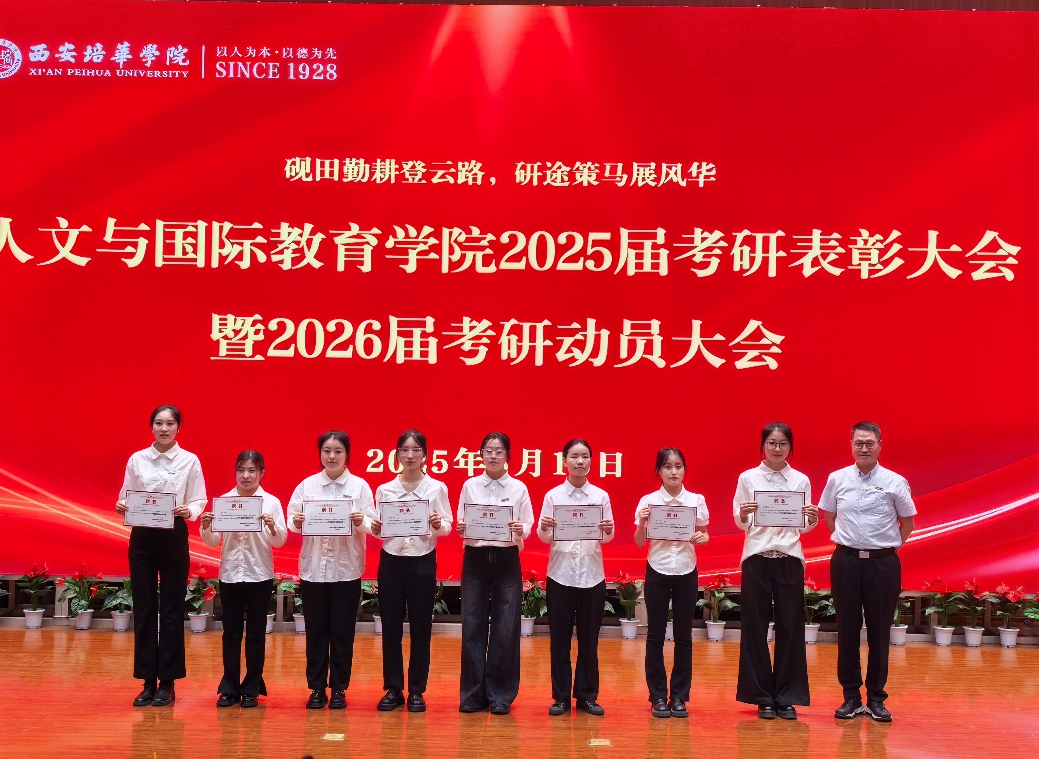 会上,院党委书记南兵宣读了《星空·官方站网页版考研升学奖学金评定办法(修订)》及《关于人文与国际教育学院 2025 年考研升学奖学金表彰的通知》文件。学院领导班子成员为荣获考研一等奖学金、二等奖学金的学生颁发荣誉证书。各专业带头人向大学生考研朋辈导师颁发聘书。