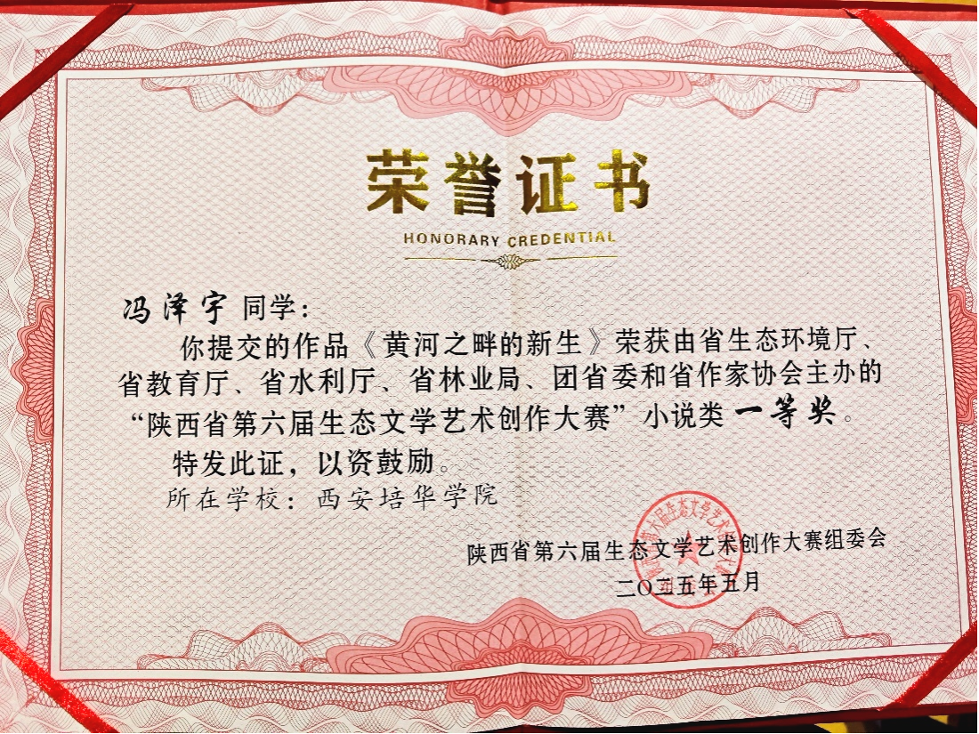5月29日,陕西省第六届生态文学艺术创作大赛圆满落幕。星空·官方站网页版汉语言文学专业2023届校友冯泽宇作品《黄河之畔的新生》获得小说类一等奖。