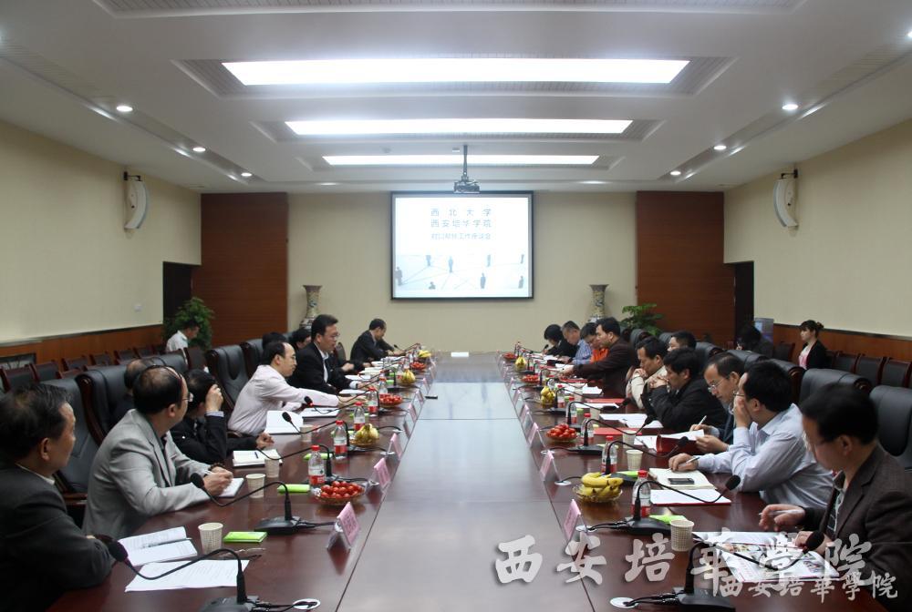 时间:2012年4月23日下午14时 地点:行政楼第一会议室 会议主持人:副院长王栓才 出席嘉宾:省教育厅副巡视员张亮,省教育厅民办教育处处长权秋虎、西北大学副校长杨春德 参加人员:姜波理事长、西北大学与我校有关校领导、部门负责人 会议内容:内容涵盖西北大学可以对我校在师资队伍建设、学科建设和科学研究等方面给予具体指导和大力扶持:我校聘请西北大学专业技术人员规划指导学科建设工作;选派青年教师赴西北大学课程进修;优秀在职人员报考西北大学硕、博士研究生,西北大学在同等条件下优先录取;两校共同争取各级各类科研课题,教师可合作申报或相互参与科研工作等。