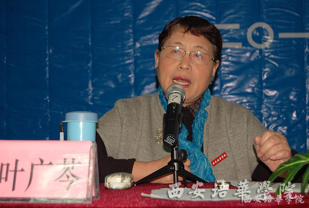 女子学院2012女性素质教育大讲堂正式开讲 时间:2012年3月21日晚19时 地点:育英楼五层3507报告厅举行 主讲人:女子学院院长叶广苓女士 ,现为国家一级作家,中国作家协会会员,西安作家协会副主席,陕西省人大代表,西安市第十、十一届政协委员。 参加人员: 子学院全体师生以及慕名而来的200多名学生 学术讲座内容:叶广岑院长引入食品安全、环境污染、城市化等社会热点话题展开论述,以秦岭为主线,以环保、生态、和谐为主题,图文并茂地介绍了秦岭的地形、环境、动物、植物、人文等要素,呼吁人与自然的和谐相处。