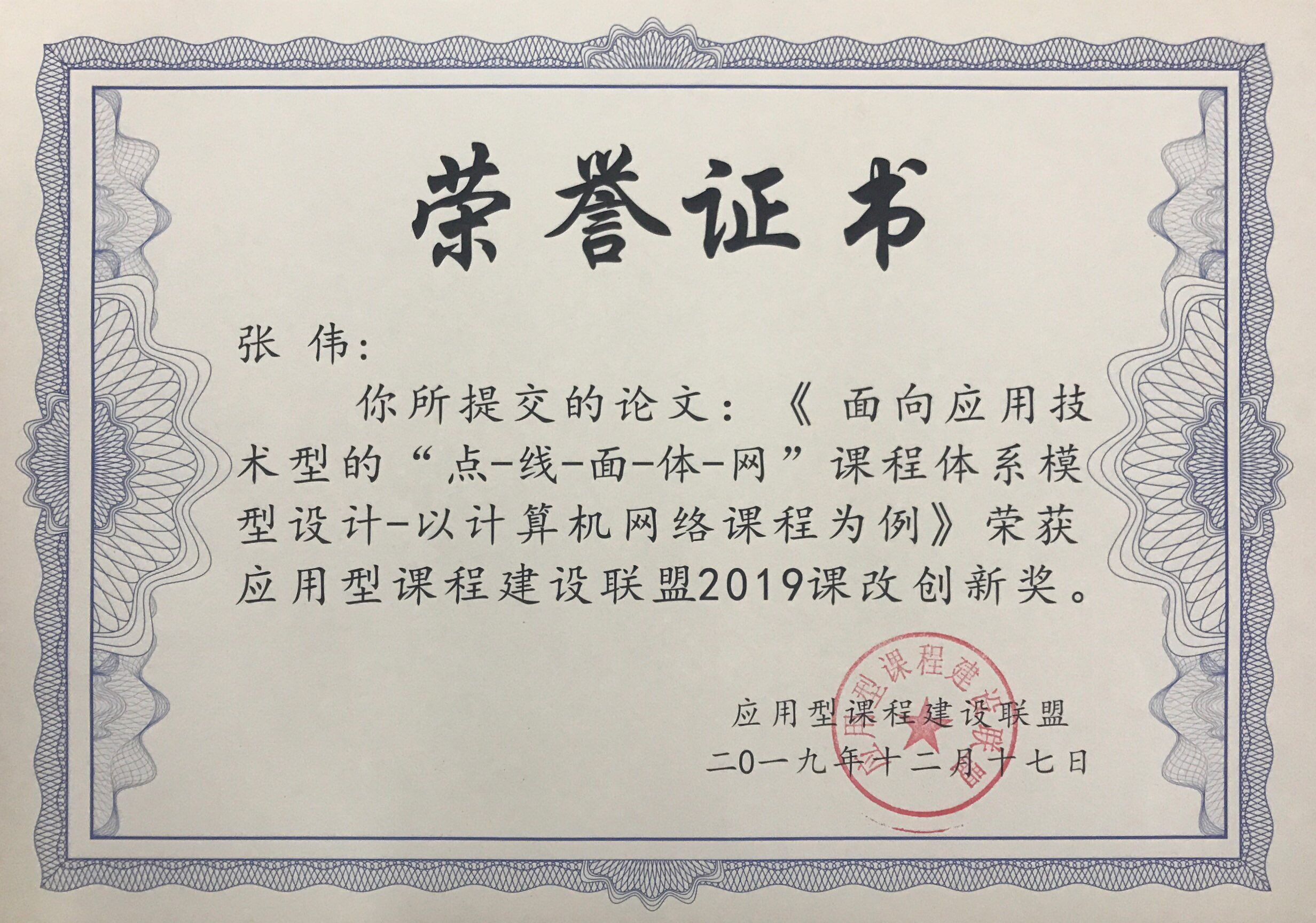 本次论坛还面向高校征集了2015年之后所公开发表的有关课程改革实践探索方面的论文,我校根据征文要求推荐了2篇论文,其中张伟老师的论文《面向应用技术型的“点-线-面-体-网”课程体系模型设计-以计算机网络课程为例》荣获应用型课程建设联盟2019课改创新奖。