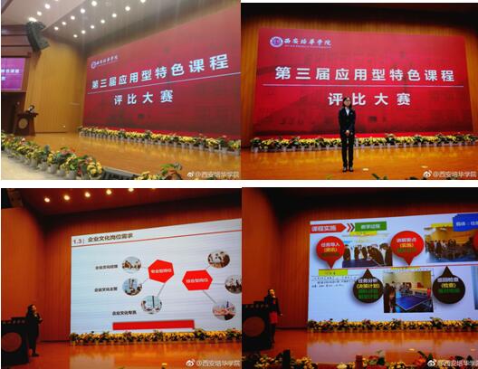 在决赛中,《无机及分析化学》应用型课程设计与实施、《工程测量》应用型课程建设、新时代的呼唤-《毛泽东思想和中国特色社会主义理论体系概论》应用型课程改革设计与实践、《模拟电子技术基础》应用型课程设计、以应用能力培养为导向的《法律文书写作》课程改革、《中级财务会计》应用型课程改革的思考、《英汉翻译》应用型课程设计与实施、“三会”引领《乒乓球》课程设计与实施等12个课程单元从课程定位、课程设计、课程实施、课程考核与评价、课程改革及建设效果等方面进行了汇报。《基于应用型人才培养的环境设计专业课程体系构建》在分析了社情、学情的基础上,结合我校的培养学生的“8大能力”,提出了该专业的人才培养目标,并对课程体系进行了解构和重构。