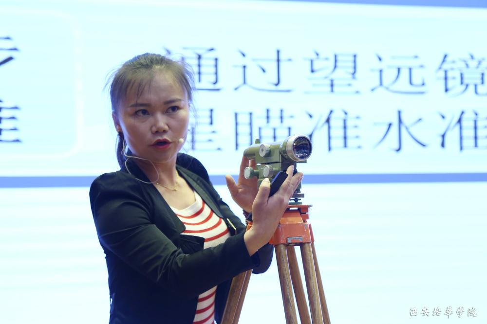 人居环境与工程学院的刘杰老师运用器材的实际操作和启发式教学讲解水准仪的操作